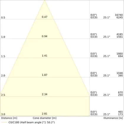 Der Abstrahlwinkel bezeichnet den Winkel, in dem das Licht aus der Lichtquelle ausgestrahlt wird. Er wird in Grad (D) angegeben. Je geringer die Gradzahl des Abstrahlwinkels ist, desto kleiner ist auch der Durchmesser des Lichtkegels, den die Lichtquelle produziert. Beispiel: Wird eine Lampe mit einem Abstrahlwinkel von 60 Grad an der Decke (2,5 m Höhe) angebracht, erzeugt sie einen Lichtkegel von 2,9 Metern Durchmesser. Hat die Lampe hingegen einen Abstrahlwinkel von 120 Grad, beträgt der Lichtkegel 8,7 Meter im Durchmesser. |