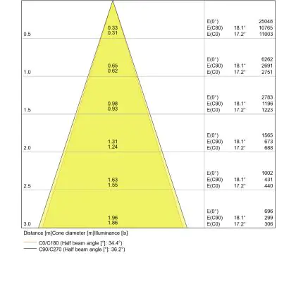 Der Abstrahlwinkel bezeichnet den Winkel, in dem das Licht aus der Lichtquelle ausgestrahlt wird. Er wird in Grad (D) angegeben. Je geringer die Gradzahl des Abstrahlwinkels ist, desto kleiner ist auch der Durchmesser des Lichtkegels, den die Lichtquelle produziert. Beispiel: Wird eine Lampe mit einem Abstrahlwinkel von 60 Grad an der Decke (2,5 m Höhe) angebracht, erzeugt sie einen Lichtkegel von 2,9 Metern Durchmesser. Hat die Lampe hingegen einen Abstrahlwinkel von 120 Grad, beträgt der Lichtkegel 8,7 Meter im Durchmesser. |