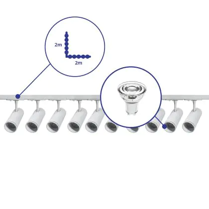 | Nom du fabricant | Complete L shaped 1-Phase Track Set White incl. 10x Spot fixture + GU10 2700K 3W Dim – 2 x 2 meters | |